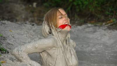 Elana Bohemia, wearing on a pair of stockings, panties and a garter belt, is trying to flee from a deadly villain. The problem is--her hands are bound behind her, she has a ball gag in her mouth, and the trail in front of her is all quicksand. At first, she skirts most of the deeper mud, only sinking up to her knees, but she is soon sinking down to her waist and getting stuck in the thick mud. Struggling only makes her go deeper, and we see her progress from waist deep, to chest deep, to neck deep. Finally, she succumbs to the mire, submerging and blowing bubbles as she goes under. There is a brief after-the-submergence segment showing Elana rising from the mud, completed covered.